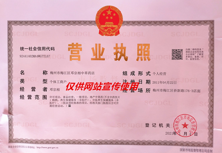 梅江区邓宗相中草药店是由法人邓宗相创立经营,址位于梅州市梅江区侨新路176-3店面,经营许可项目为:食品经营,一般项目,地产中草药(不含中药饮片)购销;养生保健服务(非医疗);中医养生保健服务(非医疗)。